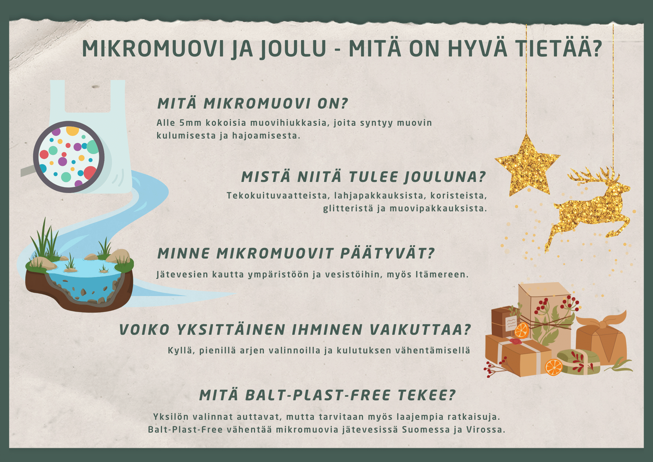 Jouluna tehdyt arjen valinnat vaikuttavat myös pinnan alla, vesistöissä asti. Kun muovia syntyy vähemmän jo kotona ja valintoja tehdään hieman harkitummin, mikromuovien määrä vähenee ennen kuin ne ehtivät vesistöihin. Joulun ajatus on välittäminen, ehkä se voi tänä vuonna ulottua myös ympäristöön.