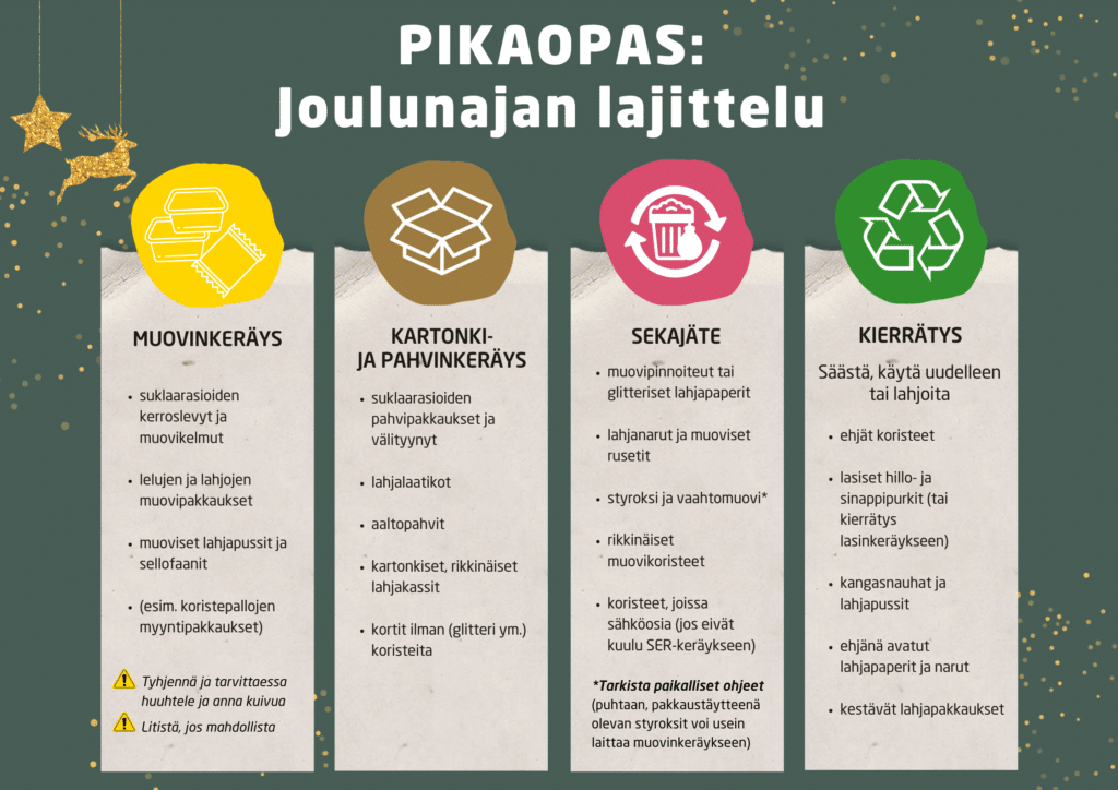 Joulun aikaan, kuin arjessa ylipäätään, muovia kertyy väistämättä. Siksi oikein tehty kierrätys on tärkeä osa mikromuovien vähentämistä. Kun muovipakkaukset lajitellaan puhtaina ja oikeaan keräykseen, ne saadaan uusiokäyttöön sen sijaan, että ne päätyisivät luontoon hajoamaan yhä pienemmiksi hiukkasiksi. Kierrätys ei poista jo syntyneitä mikromuoveja, mutta se vähentää uuden muovin tarvetta ja sitä kautta tulevia päästöjä.